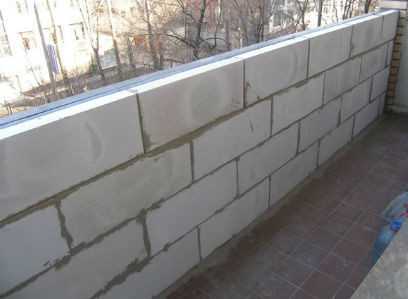 Парапет из пеноблоков выкладывают вместо металлический конструкций или параллельно им для увеличения прочности. Преимуществом материала является хорошая звуко- и термоизоляция, низкая цена и большой выбор толщины блоков при их размерах, сокращающих время при проведении работ. На пеноблоки допускается монтировать любое остекление: теплое (пластиковые окна) и холодное (алюминиевые легкие окна).